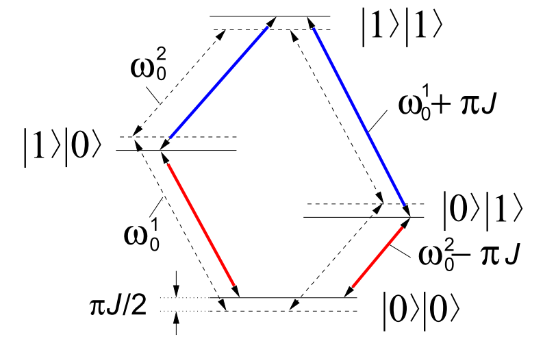 (4.26)#\[\begin{equation} \boxed{\mathcal{H}_j = \frac{1}{\hbar} \sum_{i < j}^n 2 \pi J_{ij} S_z^{i} S_z^{j}} \end{equation} \]Esta condición (\(| \omega_0^i - \omega_0^j | \gg 2 \pi |J_{ij}|\)) se cumple fácilmente para los espines heteronucleares y que también puede cumplirse para las moléculas homonucleares pequeñas. La interpretación del término de acoplamiento escalar de la Ec. (4.26) es que un espín “siente” un campo magnético estático a lo largo de \(\pm z\) producido por los espines vecinos, además del campo \(\vec{B}_0\) aplicado externamente. Este campo adicional desplaza los niveles de energía como podemos ver en la Fig. 4.5. Como resultado, la frecuencia de Larmor del espín \(i\) se mueve en una cantidad \(-J_{ij}/2\) si el espín \(j\) está en el estado \(\ket{0}\) (lineas rojas) y una cantidad \(+J_{ij}/2\) si está en el estado \(\ket{1}\) (líneas azules).