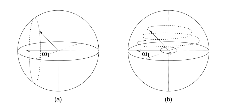 Caso resonante (\(\omega_{rf} = \omega_0\)): en este caso el primer término de la Ec. (4.34) desaparece. En este caso, un observador en el sistema rotante verá el espín simplemente precesar alrededor de \(\vec{B}_1\) (Fig. 4.6a), un movimiento llamado nutación. La elección de \(\phi\) controla el eje de nutación.